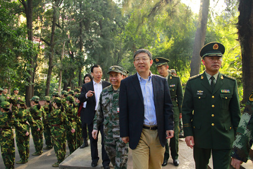 1月17日上午,我校党委书记江潭瑜在承训部队武警广东省边防总队第六支队副政委吕理淳,我校副校长李凤亮以及军训工作相关负责人的陪同下来到训练场看望正在进行军训的2015级新生,并慰问工作在军训一线的承训官兵。 看望了正在进行训练的学生后,江潭瑜来到军训临时医疗点,询问了学生的伤病情况并亲切慰问现场的医疗工作人员。为了按时完成军训任务,军训现场的教官和学生克服天气和场地条件的限制,更加积极认真地训练。...