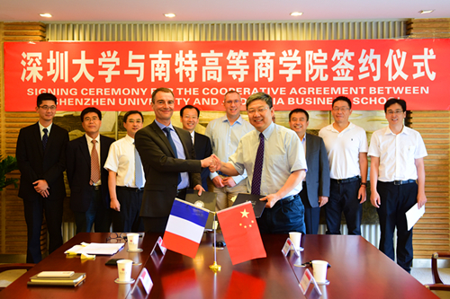 6月7日下午,我校与南特高等商学院在办公楼301举行签约仪式。南特高等商学院校长Christophe GERMAIN,我校校长李清泉,副校长李凤亮,国际交流与合作部、研究生部相关负责人参加仪式。 李清泉对Christophe GERMAIN一行的到来表示欢迎,并介绍了深大的情况。他说,深圳是一座年轻的现代化城市,建校30多年的深大也是一所年轻的大学。大多数学生来自广东省,毕业后也大都选择了留在深圳,学校为深圳的发展做出了卓越贡献。目...