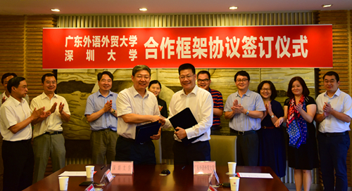 6月8日下午,我校与广东外语外贸大学在办公楼301会议室举行合作框架签约仪式。广东外语外贸大学校长仲伟合,两办、教务处、西语学院及德语系、西班牙语系负责人,与我校校长李清泉,副校长黎军,党政办、教务部、外国语学院负责人出席了协议签订仪式,并举行座谈。 李清泉对广东外语外贸大学(以下简称“广外”)专家们的到来表示欢迎。他说,今年深大获得了多项社科基金项目,值得一提的是获得了18项教育部的项目,位列广东高校...