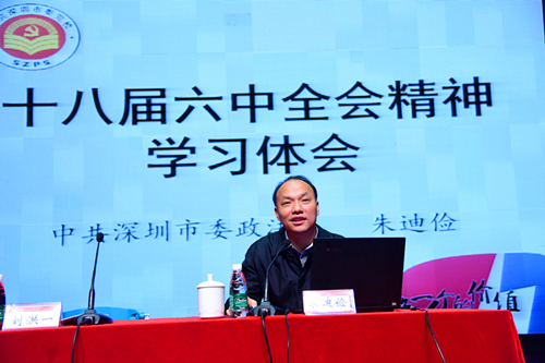 12月16日下午,深圳市委政法委专职委员、深圳市委全面依法治市工作领导小组办公室副主任,市委十八届六中全会宣讲团成员朱迪俭在我校作“学习贯彻党的十八届六中全会精神”辅导报告。我校校领导,各基层党委、党总支书记、副书记,各学院的班子成员,各直属教研教辅单位以及机关各部室正副职负责人等参加现场学习。学习会由校党委书记刘洪一主持。 朱迪俭从整体上分析了“四个全面”相互之间的关系,指出全面深化改革依托全面依...