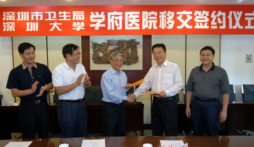 10月16日上午,深圳市卫生局、乐竞平台学府医院移交签约仪式在我校办公楼207举行。深圳市卫生局局长江捍平、副局长张丹、学府医院筹备组卢君强等出席会议;我校校长章必功、副校长陈思平、李永华及学校相关部门负责人参加会议。 《深圳卫生事业“十一五”发展规划》提出建设深圳市学府医院,此前该项目一直由市卫生局负责。今年8月22日,市政府同意将学府医院作为乐竞平台医学院的直属附属医院,由市卫...