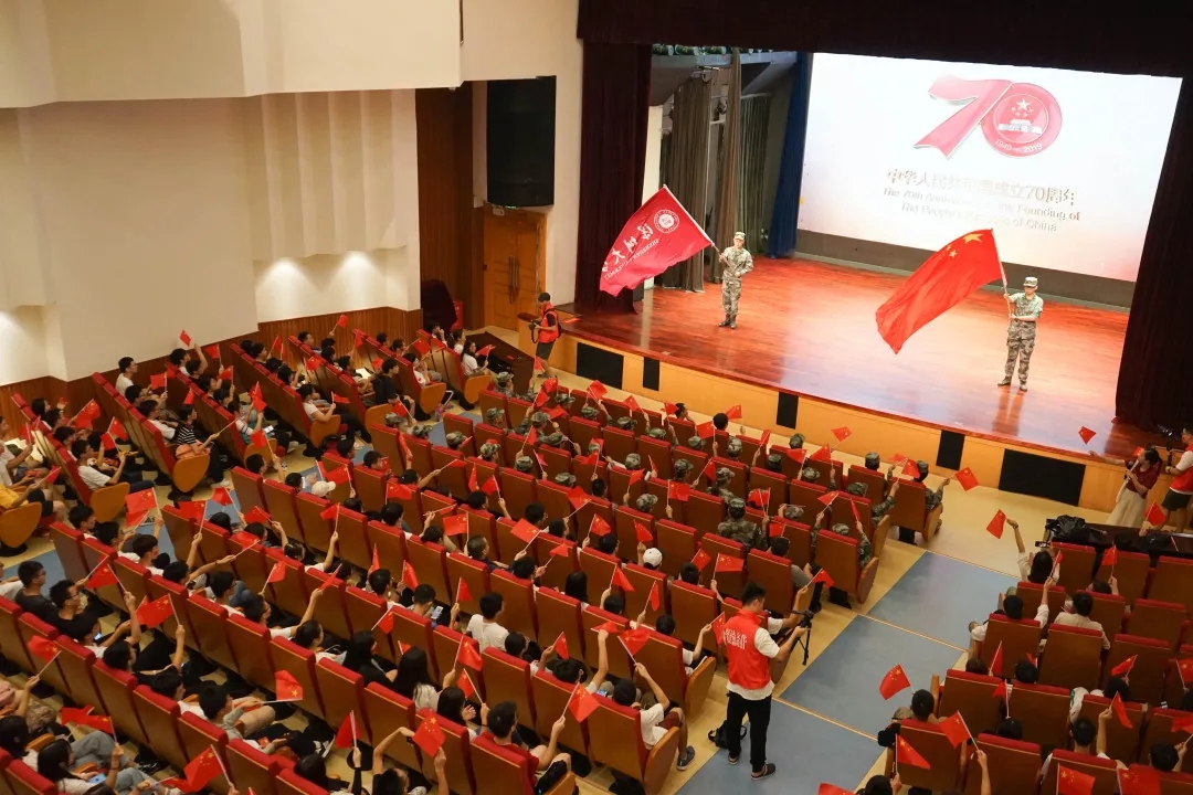 我校组织师生集中收看国庆阅兵式直播 师生挥旗合唱表白祖国