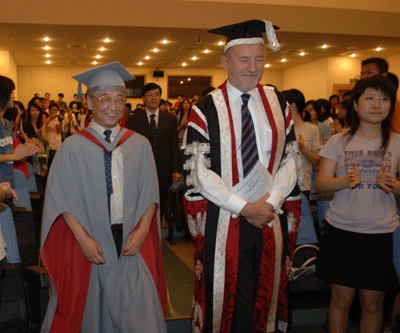2007年6月25日下午3:00,国际会议厅内,英国兰开夏大学校长Mc Vicar、副校长Murphy等代表兰开夏大学学术委员会,同身穿灰红相间学袍的乐竞平台校长章必功教授踏着优美的古典音乐步入国际会议厅。英国兰开夏大学授予章必功教授荣誉博士学位仪式在这里举行,兰开夏大学校长Mc Vicar亲自向章必功教授授予荣誉博士学位。 英国兰开夏大学外事处处长Tim Steele、兰开夏大学驻中国办事处主任Shaun Tiddy,乐竞平台副校...