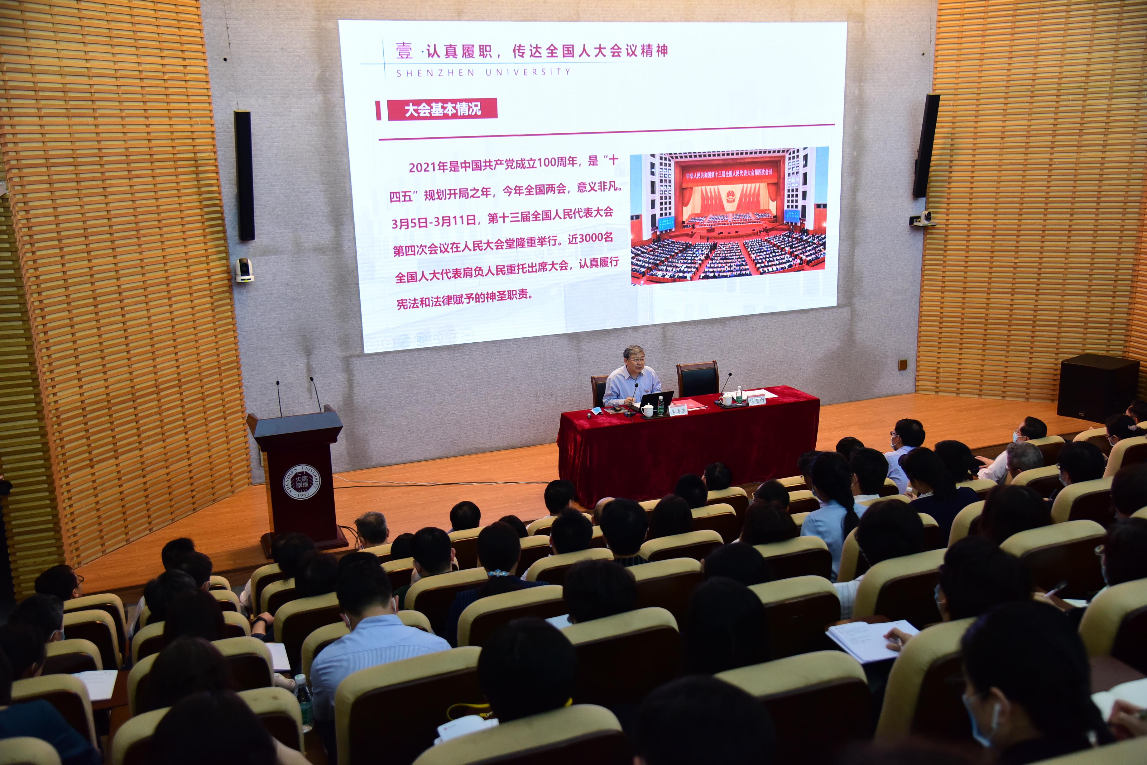 为深入学习贯彻习近平总书记重要讲话精神和全国“两会”精神,3月17日下午,学校党委理论学习中心组(扩大)学习会暨李清泉书记、校长“思政第一课”在汇星楼二号报告厅举行。学校党委副书记范志刚主持会议,校领导、校党委委员、院(部)正职领导、机关部室正副职负责人以及学生代表等现场聆听报告。