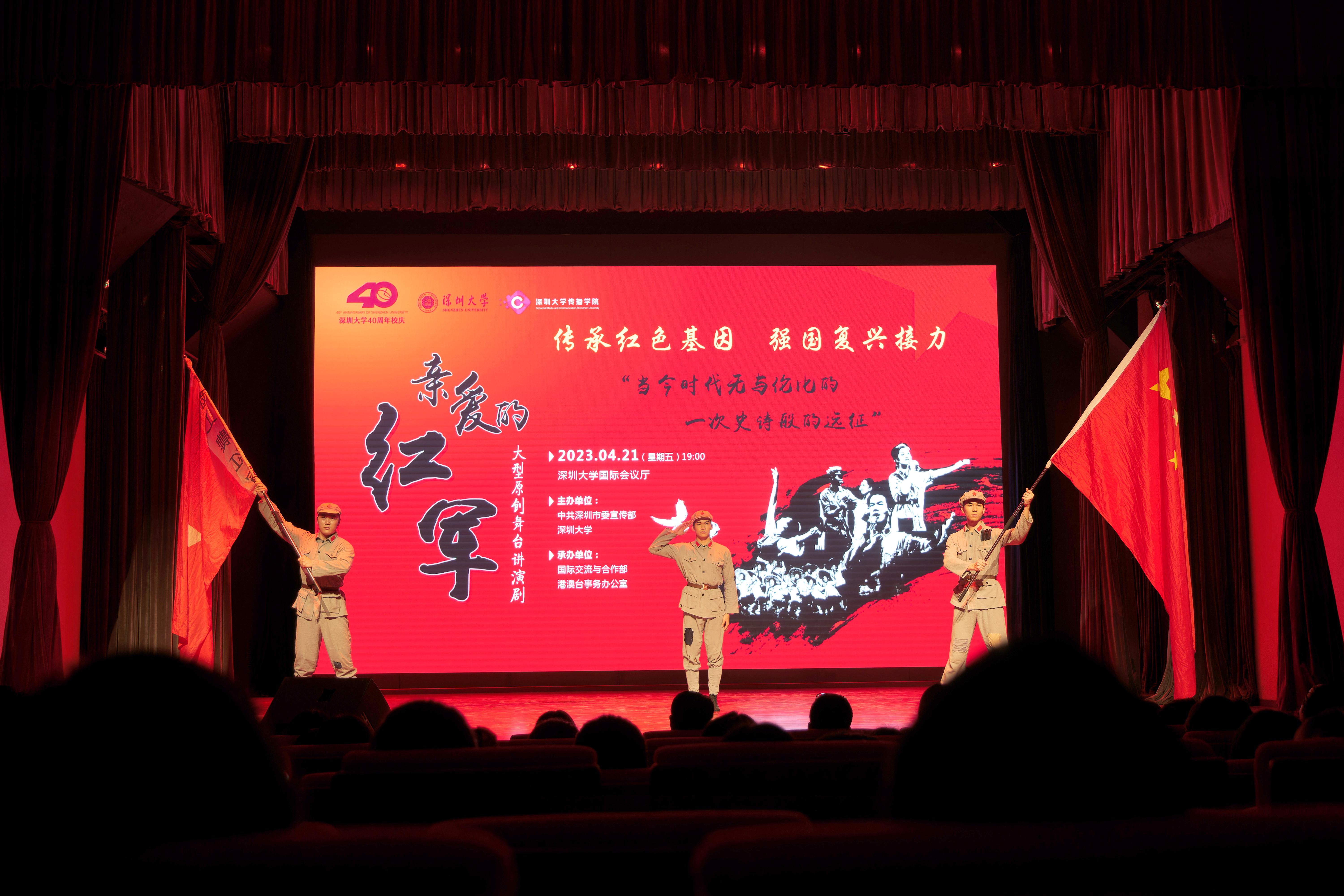 为进一步推动学校深入开展学习贯彻习近平新时代中国特色社会主义思想主题教育,深入开展干部理想信念教育,创新理论学习形式,4月21日晚,乐竞平台党委组织全校中层领导干部在粤海校区国际会议厅观看《亲爱的红军》大型原创舞台讲演剧,重温红色历史。