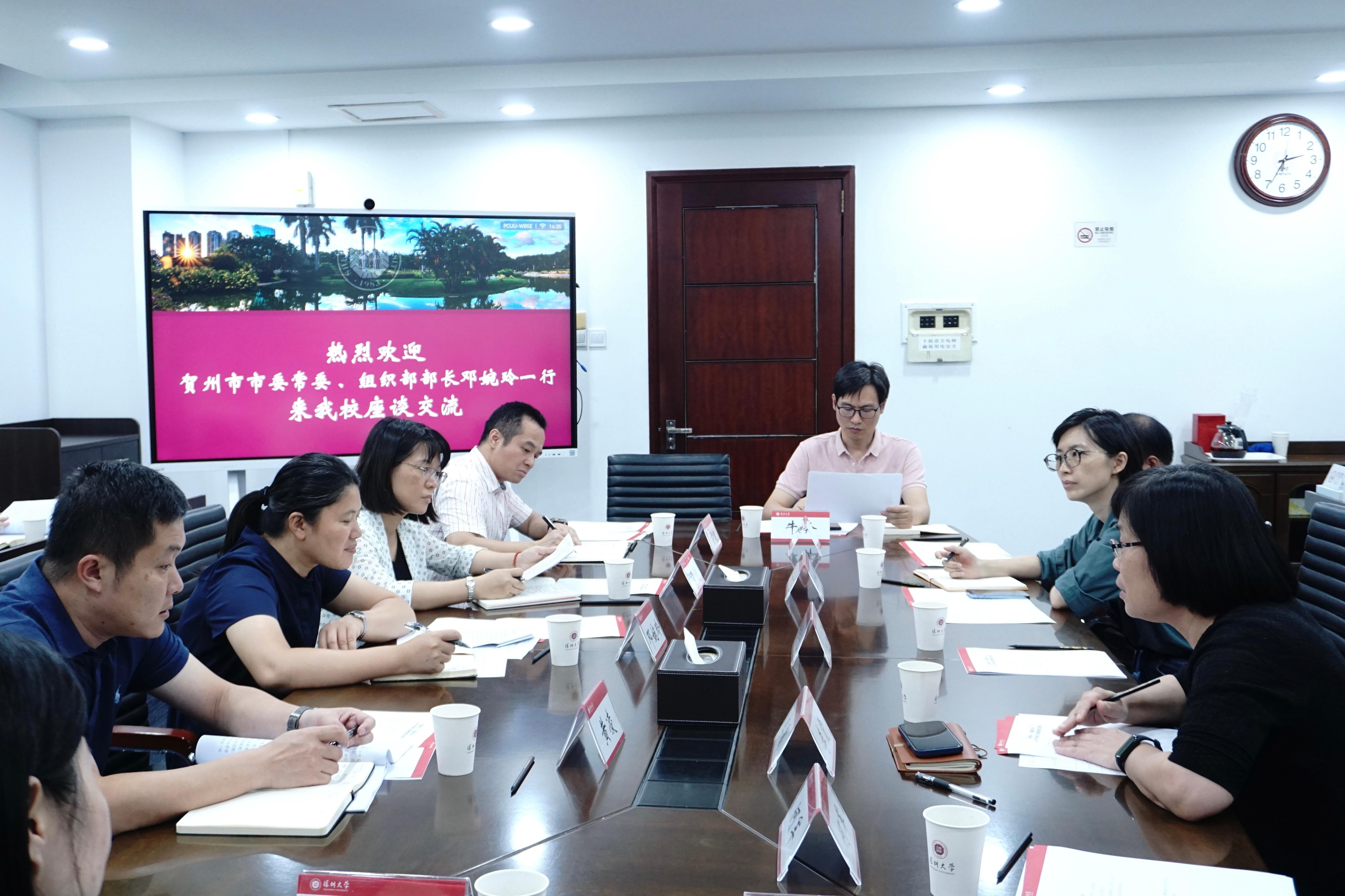 202308-31  贺州市委常委、组织部部长邓婉玲一行来乐竞平台交流为强化落实贺州市与乐竞平台签订的“市校合作框架协议”,达到互惠互利、共同发展的目的,8月29日下午,“贺州市-乐竞平台人才合作项目交流洽谈会”在乐竞平台粤海校区汇元楼会议室召开。
