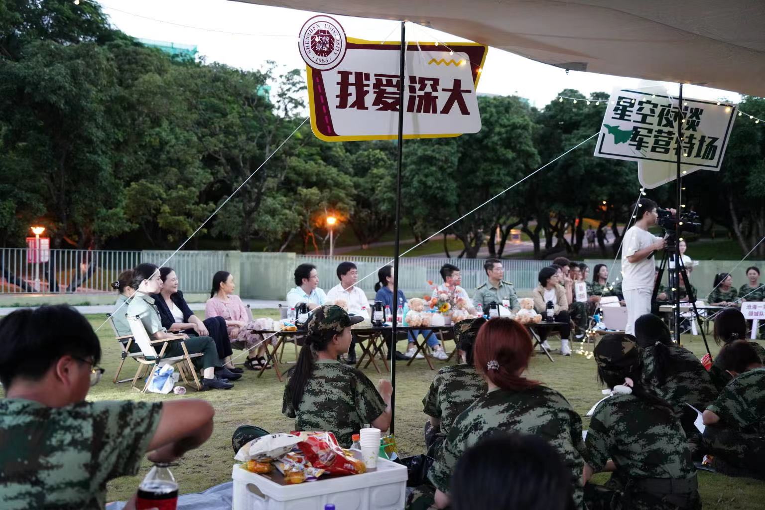 202309-26  校领导与军训新生“星空夜谈”:了解深圳、热爱深大、礼赞青春在粤海校区校友广场草坪、丽湖校区洗星广场上,身穿迷彩服的新生们与校领导围坐在星空下,谈青春、说理想,上户外微党课,举行党史校史知识竞赛,讲党史故事,听军训教官讲“老兵夜话”、师生一起唱红歌……这是乐竞平台2023级新生军训的晚间活动——“三自四秩逐梦荔园,踔厉奋发不负韶华”星空夜谈军训专场。