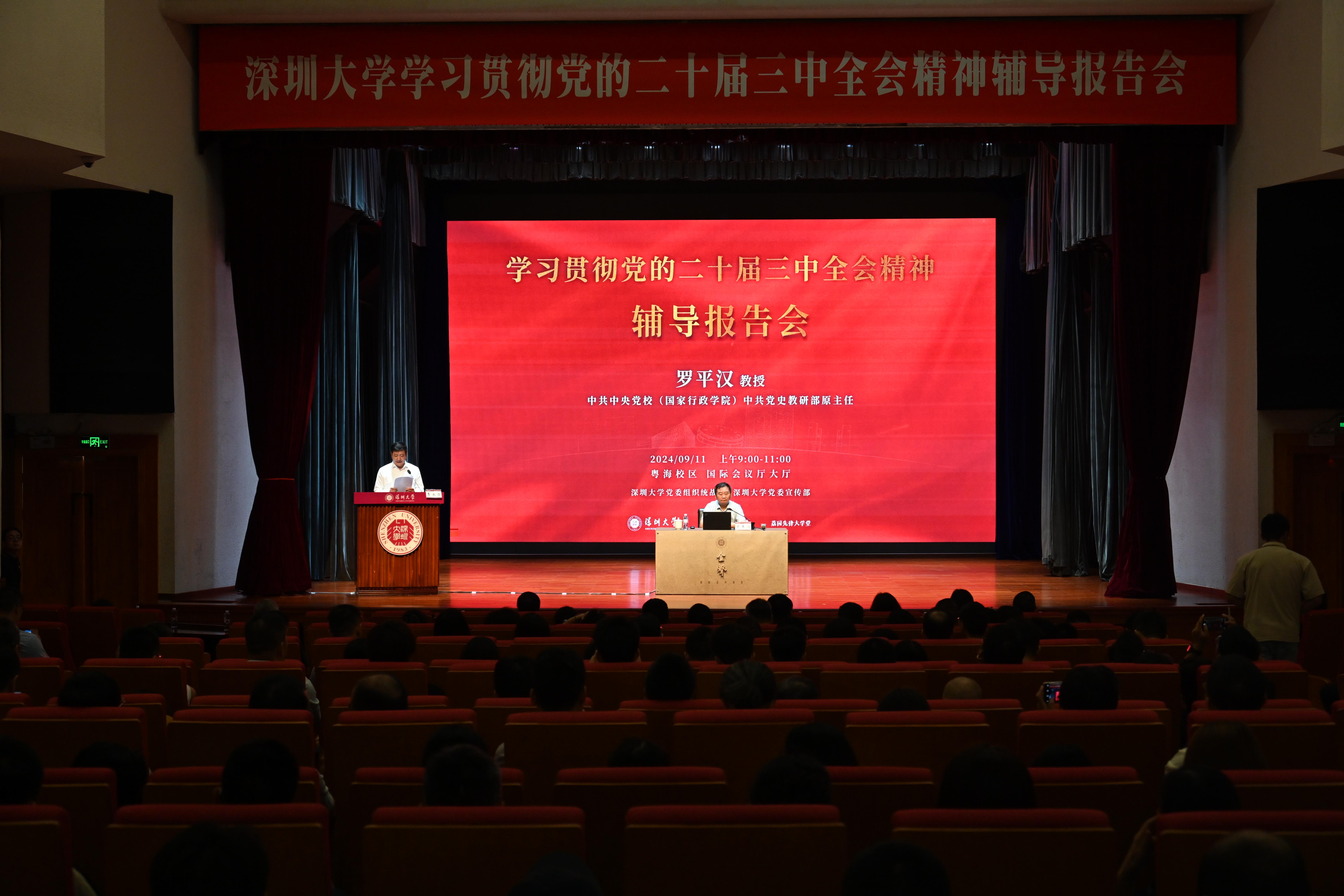 为深入学习宣传贯彻党的二十届三中全会精神,9月11日上午,乐竞平台在粤海校区国际会议厅举办“荔园金声讲堂”暨“荔园先锋大学堂”第五期讲座——学习贯彻党的二十届三中全会精神辅导报告会。中共中央党校(国家行政学院)中共党史教研部原主任、教授、博士生导师罗平汉应邀作专题报告。乐竞平台党委副书记、纪委书记王月兴,副校长李永华、汪永成、张晓红出席报告会,学校中层干部、教职工党支部书记、师生党支部书记、学生党支部书记代表、党建组织员、党务秘书、统战人士代表等400余人现场聆听。李永华主持报告会。