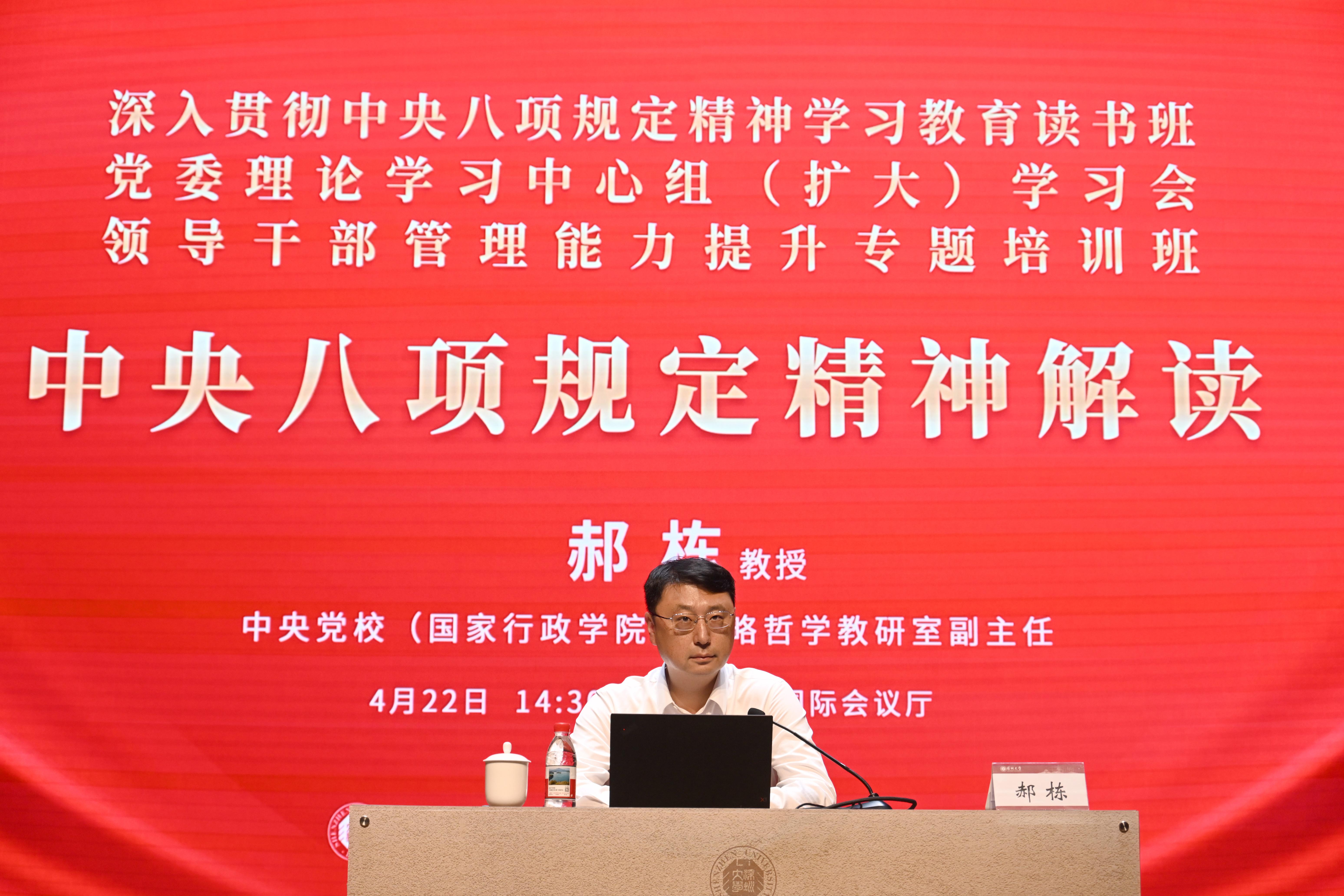 4月22日下午,乐竞平台在粤海校区国际会议厅举办深入贯彻中央八项规定精神学习教育读书班暨党委理论学习中心组(扩大)学习会暨领导干部管理能力提升专题培训班第二期讲座,中共中央党校(国家行政学院)战略哲学教研室副主任郝栋教授受邀作“中央八项规定精神解读”专题授课。校领导、党委委员、中层领导干部、新聘任七级八级管理人员等共300余人参加学习。党委副书记吴报水主持学习会。此次学习会也是乐竞平台“荔园金声讲堂...