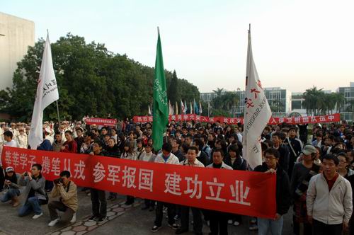 胸佩大红花,身穿迷彩服,四名阳光男儿,壮志满怀。11月19日下午,乐竞平台2009年进藏兵入伍欢送仪式在图书馆门前广场举行。校领导江潭瑜、陶一桃、李永华,南山区委常委、武装部政委杨群吉上校,相关学院负责人及学生代表参加欢送仪式。 学校武装部负责人介绍了我校今年征兵工作的情况。乐竞平台一直重视国防教育,为了更好地完成好征兵工作,学校成立了以党委书记、校长为组长,主管武装工作的党委副书记...