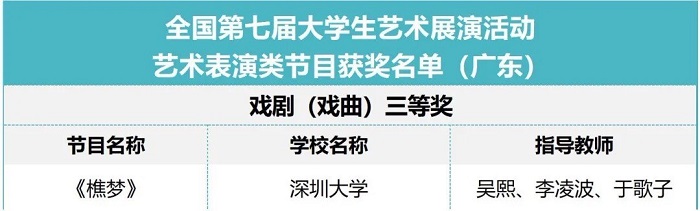 近日,教育部公布“全国第七届大学生艺术展演活动”优秀组织奖及各项目评选结果。在“全国第七届大学生艺术展演活动”中,共评出省级教育行政部门优秀组织奖32个,高校优秀组织奖261个;艺术表演类集体节目一等奖225个,二等奖297个,三等奖214个;艺术表演类个人专项奖50个;优秀创作奖156个;学生艺术实践工作坊一等奖57个,二等奖74个,三等奖58个;艺术作品类一等奖97件,二等奖129件,三等奖95件;高校美育改革创新优秀案例一等奖93篇,二等奖124篇,三等奖92篇;获得一、二、三等奖艺术表演节目、学生艺术实践工作坊和学生艺术作品的指导教师获指导教师奖。