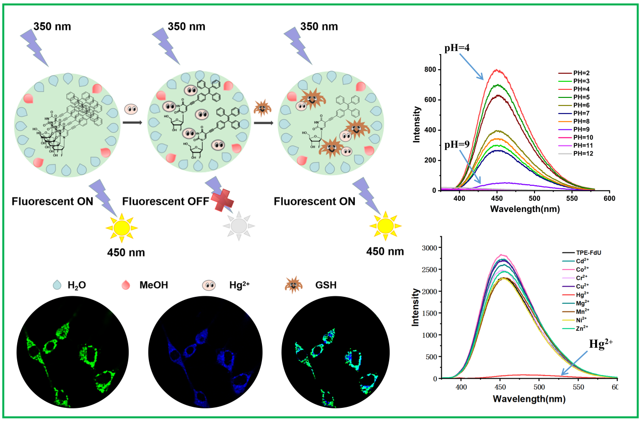 图2:有机合成的线粒体靶向核苷-AIE探针:pH调控的自组装,Hg2+高选择性检测和GSH的可逆响应及其细胞成像。