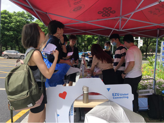 9月16日上午8时许,新学院大学全球校外学期项目的大一同学们,携带着我校录取接收函,陆续抵达第一站--我校粤海校区正门(立德门),在国际交流与合作部老师和国际交流协会志愿者的帮助下,顺利领取校园卡并进入学校。国际交流与合作部在校内沿途摆放了靓丽的指示牌,保证帕森斯项目的同学们能够顺利找到位置。相关志愿者已经等候在显眼的欢迎立牌前,帮助同学们完成信息核验和行李搬运,一起前往位于文山湖畔的留学生楼一楼的阅览室报到。