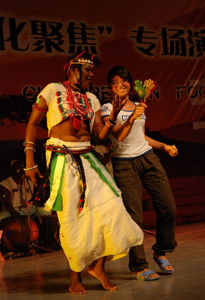 尼日利亚阿达玛瓦国家艺术团的演员一上台就为观众呈现了热辣辣的“富拉尼舞”,阵阵掌声伴随着舞台的鼓点响彻夜空,现场气氛热烈,掌声、欢呼声络绎不绝。接下来,我校艺术团学生表演的傣族舞蹈《水姑娘》。互动环节主持人邀请观众上台,由舞蹈演员教授非洲舞蹈,台上的观众们学得津津有味,台下的观众不停地为他们欢呼、鼓掌,使得现场气氛再一次达到高潮。我校艺术团学生表演的踢踏舞《勇往直前》将晚会带入又一个高潮。晚会在尼日利亚艺术团表演的“拉卡舞”中圆满落下了帷幕。