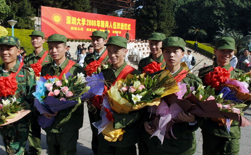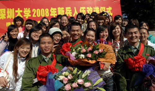 新兵代表温金泉同学在欢送仪式上发言。他说,党和国家挑选了我们,让我们光荣加入中国人民解放军,我们会尽快从一名普通青年成长为一名战士,为祖国奉献自己的一切。在部队上展现出自己的最佳状态,争取早日立功,为深大的老师同学增光。