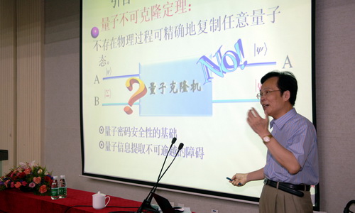 郭光灿主要从“什么是量子信息”,“量子计算的研究状况”以及“量子密码的最新进展”等几个方面进行介绍。他说,支配着电子计算机每十八个月翻一番的莫尔定律必将失效,而量子信息技术可以突破现有信息技术的物理极限,为信息科学的发展提供新的原理和方法。量子信息是量子物理与信息科学相融合的新兴交叉学科,基于量子力学的特性,如叠加性、纠缠性、非局域性和不可克隆性等,量子信息可以突破现代信息技术的物理极限,开拓出新的信息功能,量子密码可以提供不可窃听、不可破译的绝对保密通信,量子计算具有巨大的并行计算能力,提供功能更强的新型运算模式。量子信息技术有望以崭新原理和方法开拓后莫尔时代的新一代信息技术。