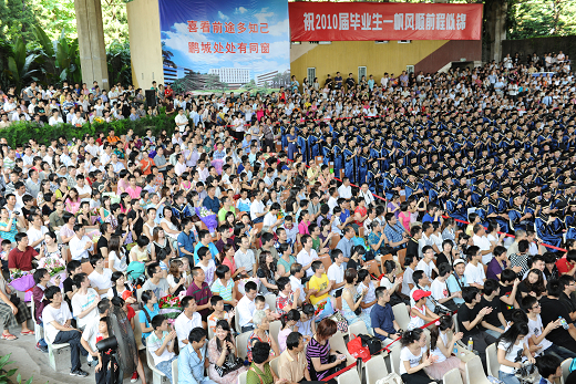 仪式举行期间,阳光灿烂,鲜花簇拥,镁光灯闪烁,电子大屏幕播放着校长章必功教授的2010年毕业致词和浓缩了毕业生在乐竞平台四年美好时光的记录短片,学校采桑子合唱团深情吟唱《同桌的你》和《送别》,导师笑容满面、毕业生热情致意、家长满怀欣慰……一万余名来自全国各地的毕业生亲友,共同见证了这激动万分的时刻。