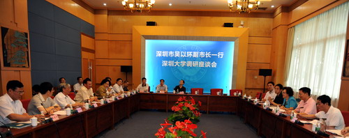 7月27日下午,深圳市副市长吴以环一行到我校调研医学院的建设情况。吴以环在校长章必功的陪同下,参观我校医学院标本陈列室、模拟手术室、医学机能学实验室、医学形态学数码互动教学。下午三点,吴以环一行在国际会议厅D 厅与我校领导以及医学院教师进行座谈。校党委书记江潭瑜、校长章必功、党委副书记陶一桃、副校长阮双琛、李永华参加了座谈。