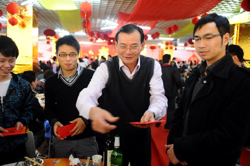 金虎留福辞旧岁 玉兔送瑞迎新年。大年三十的深大校园,洋溢着一股浓浓的年味。为了让留校过年的师生也能感受家庭般的温暖与幸福,大年三十中午,校领导江潭瑜、陶一桃、阮双琛、邢锋、李永华率有关部门和各学院负责人、老师,与留校师生及部分学生家长欢聚一堂,共进除夕团圆饭,欢歌热舞庆新春。活动由副校长李永华主持。