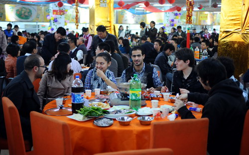 团圆饭在深大新西南餐厅举行。一副春联“心随琅琅书声乐,情系欣欣桃李诗”,道出了荔园美景和师生间的美好情谊;彩色气球、大红灯笼和师生们一张张喜气洋洋的笑脸相互辉映。老师和同学,吃着盆菜、火锅,唱着歌、跳着舞,一声声“新年好!”“新年进步!”说出了心中最美好的祝福。
