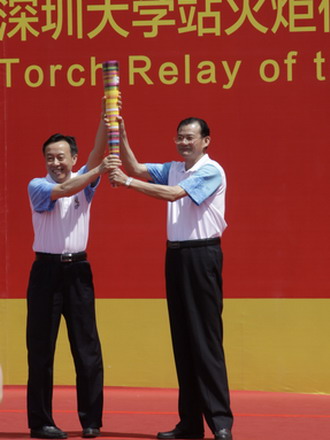市政协副主席钟晓渝代表深圳市向乐竞平台赠送火炬,校党委书记江潭瑜代表乐竞平台接受深圳市赠送的火炬。第26届大学生夏季运动会乐竞平台站火炬传递仪式圆满结束。5月15日,大运火炬将移师广州大学城进行传递。8月10日、11日将在深圳市区传递。