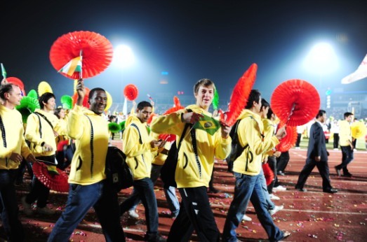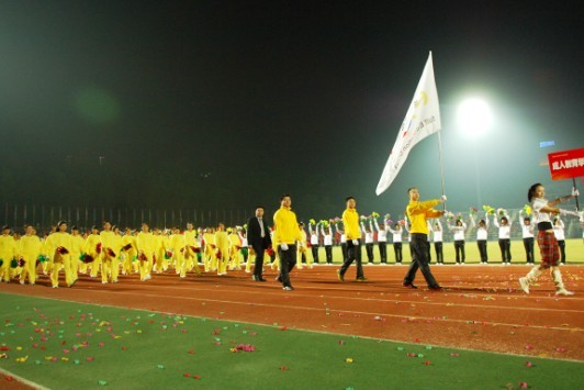 弘扬大运精神,再续精彩赛事。12月5日晚,我校2011年综合运动会在田径场盛大开幕。全体在家校领导,中国工程院院士牛憨笨、中国科学院院士倪嘉缵及各学院、教研教辅单位负责人和我校近两万名师生参加开幕式。开幕式由副校长邢锋主持。