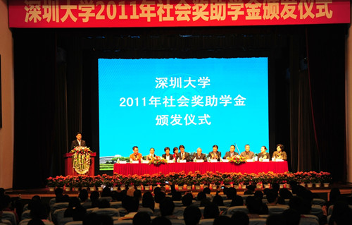 12月28日下午,我校2010-2011年度奖助学金颁发仪式在国际会议厅举行。好日子奖学金、永亨银行奖学金、恒生银行内地奖学金、肯德基曙光基金助学金、慈文新生奖助学金、永旺教育基金、狮子会励学金、深大校友高尔夫俱乐部奖助学金等各设奖(助)单位代表,我校校长章必功,党委副书记陶一桃、副校长李永华,各学院、部室负责人和社会奖助学金获奖学生代表参加了仪式。仪式由李永华主持。