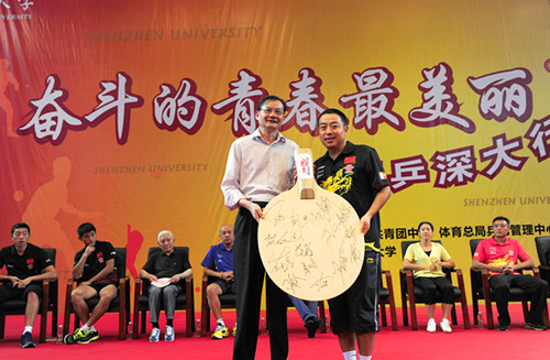 江潭瑜和刘国梁互赠纪念品。深大向中国乒乓球队赠送了一幅《鹏城万里图》,展现了深圳改革开放34年来的成果;刘国梁则回赠深大一只有中国乒乓球队全体签名的巨型乒乓球拍,以及一张国家队专用的乒乓球台。