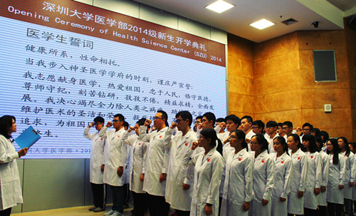 10月19日下午,我校医学部2014级新生开学典礼在医学部学术报告厅举行。中国工程院院士、我校医学院名誉院长钟南山,北京大学党委常委、常务副校长柯杨,深圳市卫生和计划生育委员会主任罗乐宣,我校党委副书记、纪委书记陶一桃,副校长徐晨,科研处、教务部相关负责人,各兄弟单位的领导、专家以及附属医院、医学院教师代表、部分学生家长和医学院2014级全体新生参加了典礼。