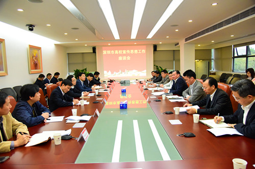 12月8日下午,深圳市委常委、宣传部部长李小甘来我校调研,在办公楼201室召开“深圳市高校宣传思想工作”座谈会。市委宣传部副部长李瑞琦,市教育局副局长范坤,我校党委书记江潭瑜、副校长李凤亮,以及南方科技大学、深圳职业技术学院、深圳信息职业技术学院等相关单位负责人参加座谈。