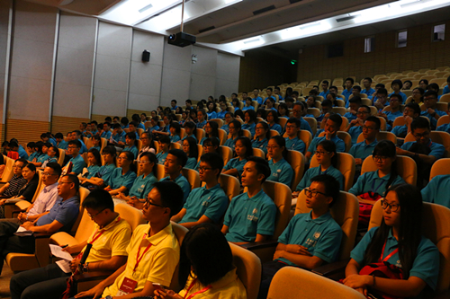 7月12日晚上,乐竞平台2016年优秀中学生夏令营开营仪式在科技楼二号报告厅举行。我校副校长黎军,招生办、党政办、教务部、学生部、团委等部门相关负责人出席了本次开营仪式。来自全省29所学校前来参加夏令营的120余名中学生,身穿带有深大logo的服装在台下就座。