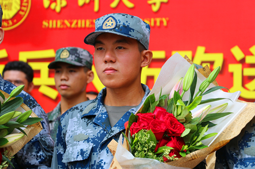 9月10日上午,我校在学生活动中心举行入伍新兵欢送仪式。副校长李凤亮,南山区武装部余富荣政委,校党委宣传部、各学院领导及师生代表、退伍学生代表冒雨出席了仪式。