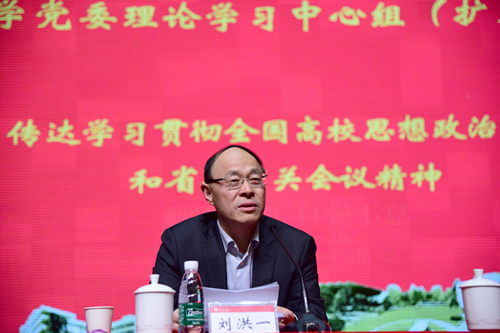 刘洪一在校党委理论学习中心组(扩大)学习会上传达了中央、省委关于学习贯彻全国高校思想政治工作会议的精神。他说,全国高校思想政治工作会议是我国高等教育发展史上具有里程碑意义的一次会议。习近平总书记的重要讲话内涵丰富、博大精深,通过学习,刘洪一认为主要有以下几个方面要重点领会和把握。一是指明了高校的办学方向和历史使命。讲话中明确了高校必须坚持党领导、坚持正确的办学方向、走中国特色的社会主义办学道路。讲话直截了当地回答了“办什么样的大学、怎样办大学、为谁办大学”这个根本问题,为高等教育未来的发展提出了总体要求。二是强调了高校的核心任务是人才培养,立身之本是立德树人。习近平总书记在讲话中特别强调“培养什么样的人、如何培养人以及为谁培养人”这个根本问题一定要解决好。要坚持把立德树人作为中心环节,把思政工作贯穿教育教学全过程,实现全程育人、全方位育人。特别是提出只有培养出一流人才的高校,才能够成为世界一流大学。对此,我们必须要不忘初心,不忘根本,牢牢把握人才培养和立德树人的核心任务,以此来带动高校其他工作。三是明确了新形势下开展思想政治教育的规律和路径。具体来说要因事而化、因时而进、因势而新。路径要用好课堂教学这个主渠道,要加快构建中国特色哲学社会科学学科体系和教材体系,以文化人、以文育人,结合校园文化活动和社会实践,专业课教师要把教学和育人相结合。要运用新媒体,增强时代感和吸引力,拓展思政工作的新路径。四是寄望广大人民教师做教书育人神圣使命的承担者。要加强师德师风建设,引导广大教师以德立身、以德立学、以德施教,担负起学生健康成长指导者和引路人。五是要求高校党委担当思想政治工作主体责任。习近平总书记在讲话中指出,高校党委对学校工作实行全面领导,承担管党治党、办学治校主体责任,把方向、管大局、作决策、保落实。加强高校基层建设,确保高校和谐稳定,培育优良校风和学风,使高校发展做到治理有方、管理到位、风清气正。