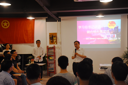 “学习习总书记讲话 做合格共青团员”为了增强团员先进性和光荣感,实现中国梦凝聚青春力量,积极贯彻落实团中央的指示精神,5月7日晚,我校信息工程学院2014级电子信息工程二班同学在校团委组织下,在创业学院一楼咖啡厅开展了“学习习总书记讲话 做合格共青团员”主题团日活动。副校长王晖,校团委、信息工程学院领导参加了此次主题团日活动。