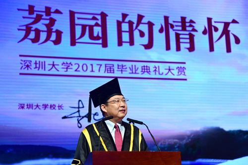 30多年来,十多万深大校友投身特区建设,从幼儿园老师到教授、博导;从公司白领到公务人员;从律政精英到金融才俊;从代表中国制造征战全球的科技达人到奥运赛场高扬五星红旗的体育健儿;从打造城市空间的地产大亨到塑造城市精神的创意巨头;从创业路上艰苦奋斗的年轻人到改变10亿人生活方式,公司市值超过70%国家GDP的大boss,他们与这座城市共同奋斗、共同成长,全力参与、亲身见证了小渔村蝶变为大都市的奇迹。这座城市的天际与隧道,高楼与街巷,到处奋斗着深大人的梦想。2016年初次就业数据显示,深大毕业生89%在深工作,多年来,这是绝大部分校友的共同选择。十几万校友的背后是几十万个家庭和成千上万家企业、团队,他们和亲人、朋友、同事及所有相关社群,共同构成了一个强大的“深大圈层”。他们贡献给城市的不仅是税收,更是一整个营商体系和创新生态;不仅是励志故事,更是一种改变与创造的文化品格;不仅是特区教育的成果背书,更是一座城市的未来和梦想。同学们,请你们记住:无论身处何方,你们的笑容就是深圳的颜值;你们的奋斗就是深圳的梦想;你们的未来就是深圳的未来!