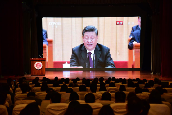 校领导刘洪一、李清泉、范志刚、卢成燕、王晖、李永华,中层干部、教师代表和学生代表等近450人在乐竞平台国际会议厅集中收看大会直播。各基层党委、各部门采取多种形式,积极利用电视、网络、广播等多种传媒,认真组织广大党员干部和师生员工收听收看大会实况。学校办公楼、教工餐厅、学生食堂等多地电子显示屏也播放直播画面,广大师生驻足观看。