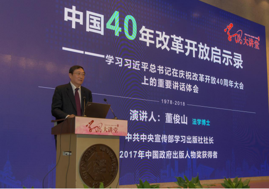 董俊山总结了四位嘉宾的演说并发表了题为《中国40年改革开放启示录》的主旨演讲。带领与会人员细致学习了习近平总书记在庆祝改革开放四十周年大会上的重要讲话。他表示,理解领会学习习近平总书记的讲话不能就文字解读文字,也不能就一篇文章去领会总书记的思想。要坚持马克思主义辩证唯物主义和历史唯物主义立场、观点、方法,要紧密结合毛泽东、邓小平、江泽民、胡锦涛、习近平关于治国理政的系列思想论述。改革开放只有进行时没有完成时,要动员和激励全国人民坚定信心跟党走,新时代要创造新的中华民族奇迹。
