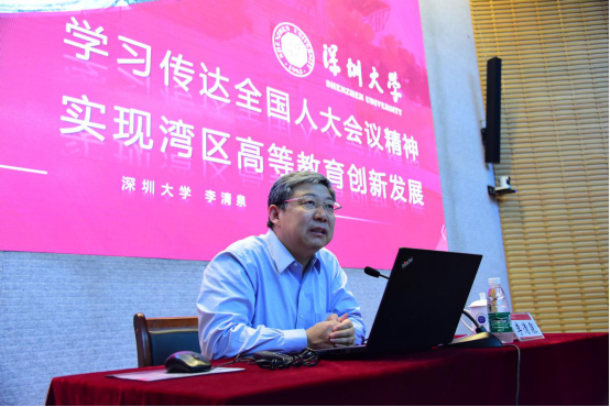 李清泉通过大量的案例、数据,以及身临其境的深切感受,传达了人大会议精神,阐释了实现湾区高等教育创新发展的路径,明确指出了学校努力前行的方向。讲课结束后,师生们纷纷致以热烈的掌声。
