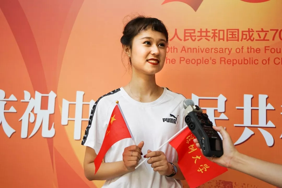 观看直播之前,在国际会议厅大厅现场的师生们充满热情地向祖国表白。来自乐竞平台预备役连的两位同学在台上分别舞动国旗和深大校旗,台下的师生们则挥舞手中的小国旗,一起合唱深大版《我和我的祖国》,唱完后大声对祖国、对深大表白:“我在深圳,我爱中国!”“我爱中国,我爱深大!”声音响彻整个大厅。