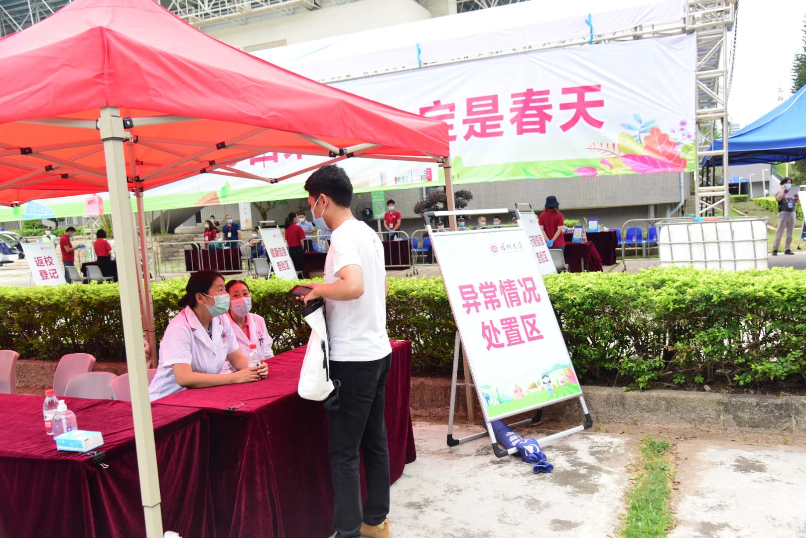 演练中,校医发现一位学生体温异常(>37.3℃),立即将其引导至临时观察区进一步问诊,检查并询问旅居史、接触史,并按指引需要将其送至南山医院发热门诊进行诊治。校医则做好相关记录并向指挥部报告,指挥部通知学生工作组,由该生所在学院对该生进行跟进,必要时提供协助。指挥部通知后勤保障组对临时观察区进行消毒。在行程信息查验区,返校学生现场扫码进行查验,按行程信息分不同通道进入。深i您健康码、深大学生返校健康信息健康码、核酸检测结果为阴性等健康信息正常的学生方可入校。