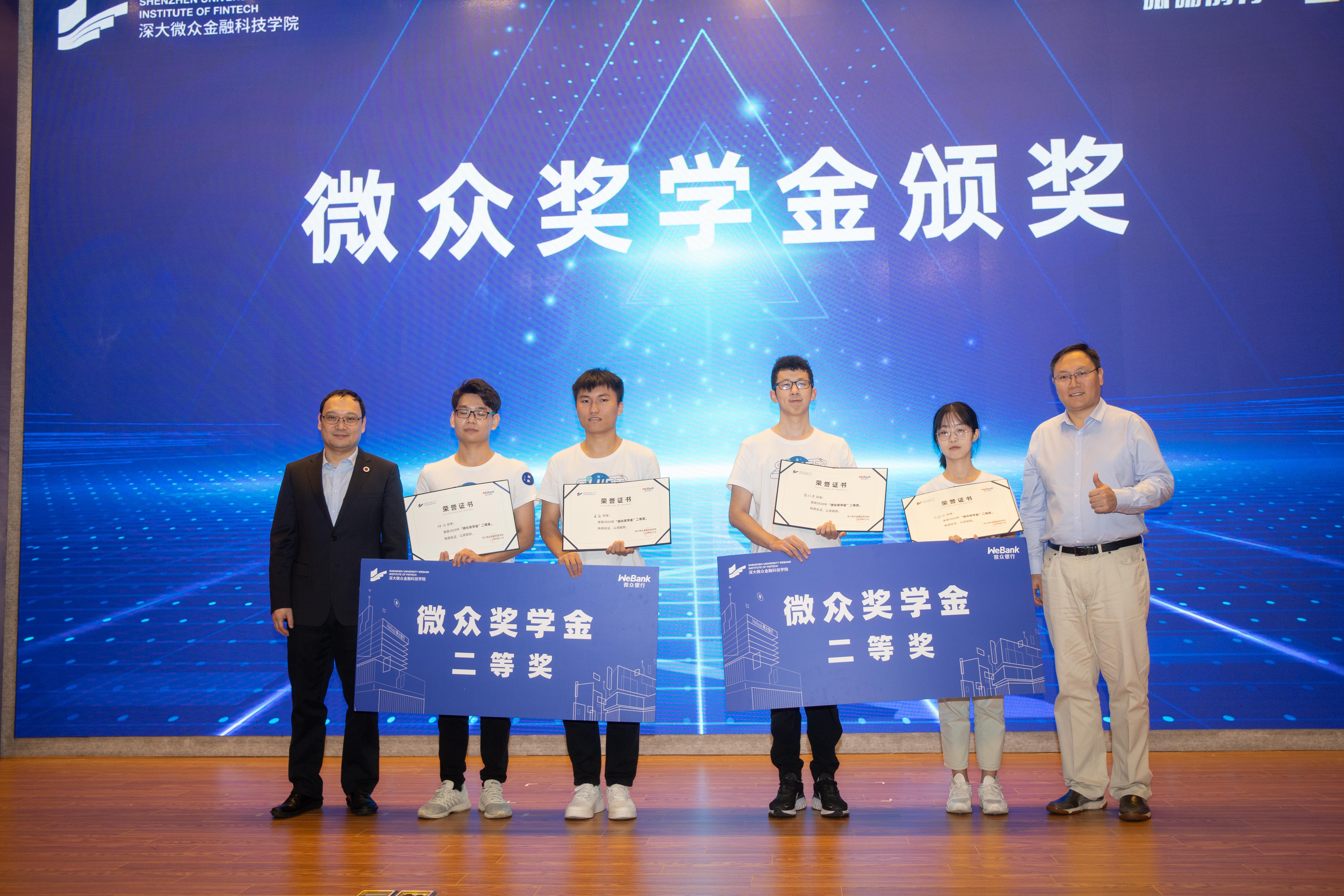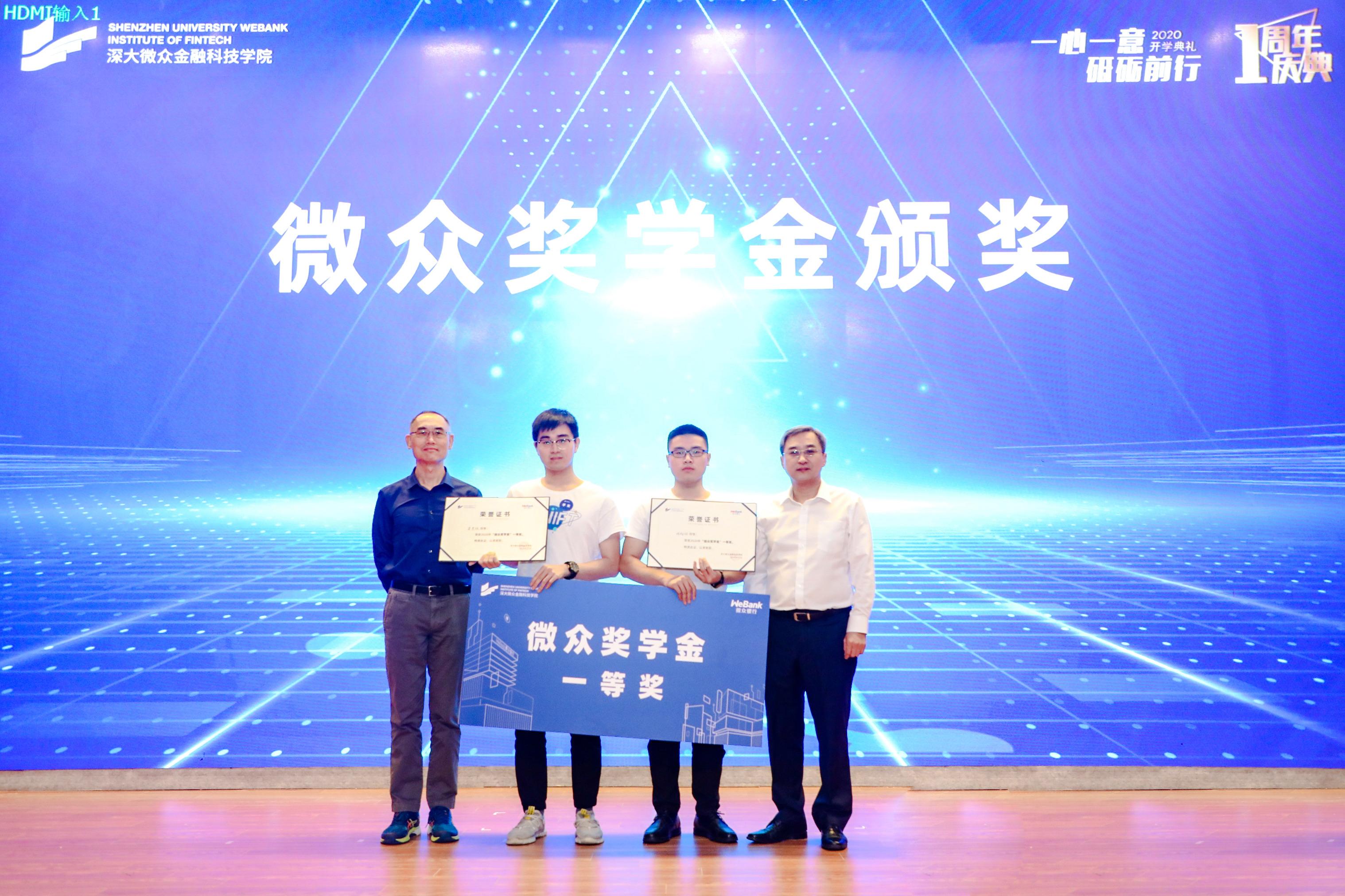 为鼓励品学兼优、特长突出的金融科技专业学生,微众银行冠名捐资设立“微众奖学金”,2020年首次评选。经过严格筛选,12名成绩优异、能力突出的优秀学生获此殊荣。学子们也分享了自己选择深大微众金融科技学院的初衷。2020级新生、本科生代表孙艺迪认为,金融科技行业与学院处于起步和成长期,就像40年前的深圳,虽无经验可循,但却是改革和创新的先行者,金融科技这一复合型学科可以让自己学到更多知识,且校企合作办学前景广阔,师生们可以自己创造辉煌的未来,开创新天地。研究生代表周传洋以及2018级学生、优秀学生代表王鑫也分别上台发言,分享了在学院的学习感受,表达了对学院的感谢和祝福。