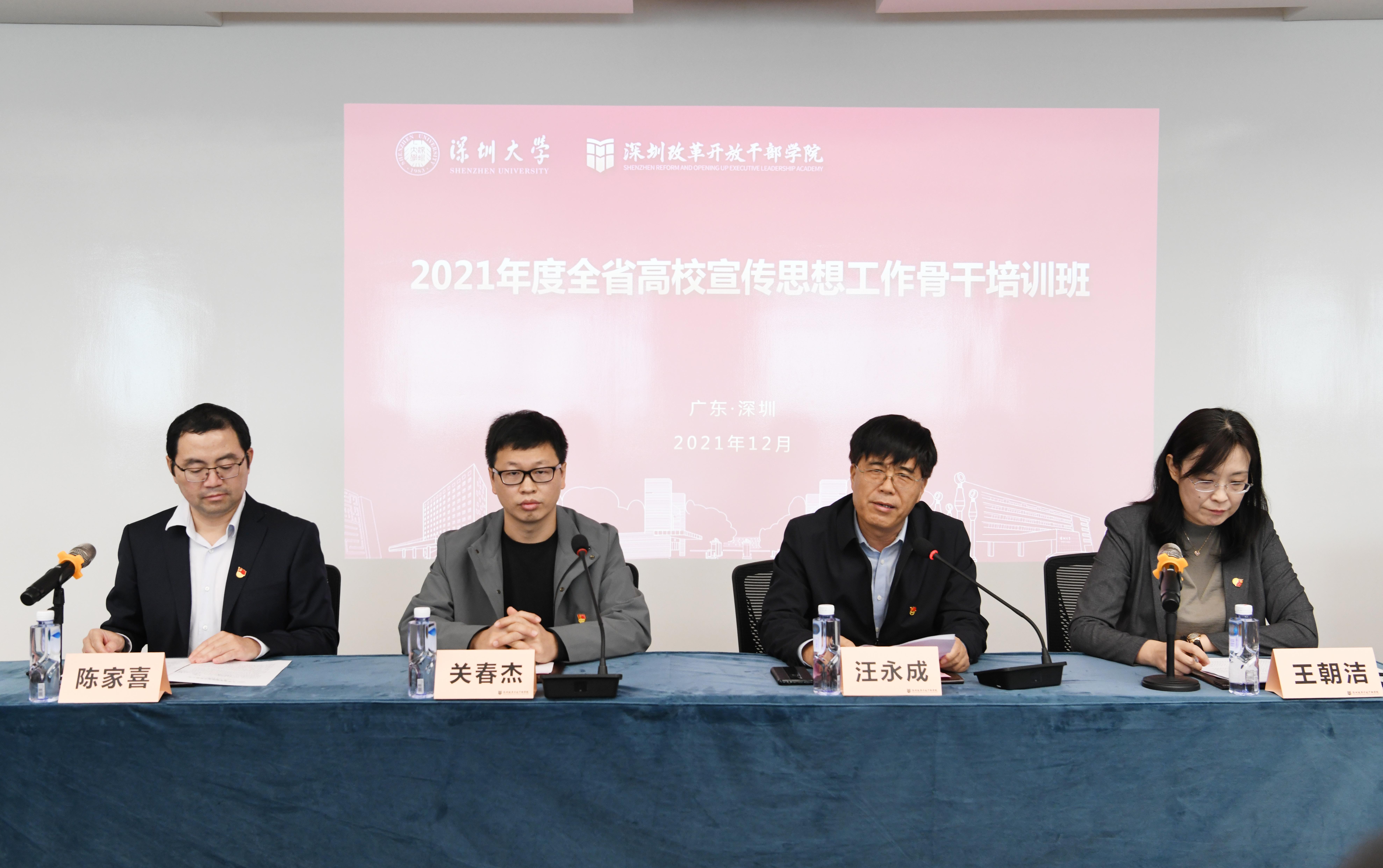 为深入学习贯彻党的十九届六中全会精神,进一步加强广东省高校宣传思想工作,提高高校宣传思想干部队伍建设水平,12月14日,由省委教育工委主办、乐竞平台党委承办的2021年度全省高校宣传思想骨干培训班在深圳改革开放干部学院正式开班。广东省委教育工委思想政治工作与宣传处副处长关春杰,乐竞平台党委常委、副校长汪永成,深圳改革开放干部学院副院长陈家喜出席开班仪式并致辞。乐竞平台党委宣传部部长王朝洁主持开班仪式,来自全省各高校的140余名宣传思想骨干参加培训,培训班为期4天。