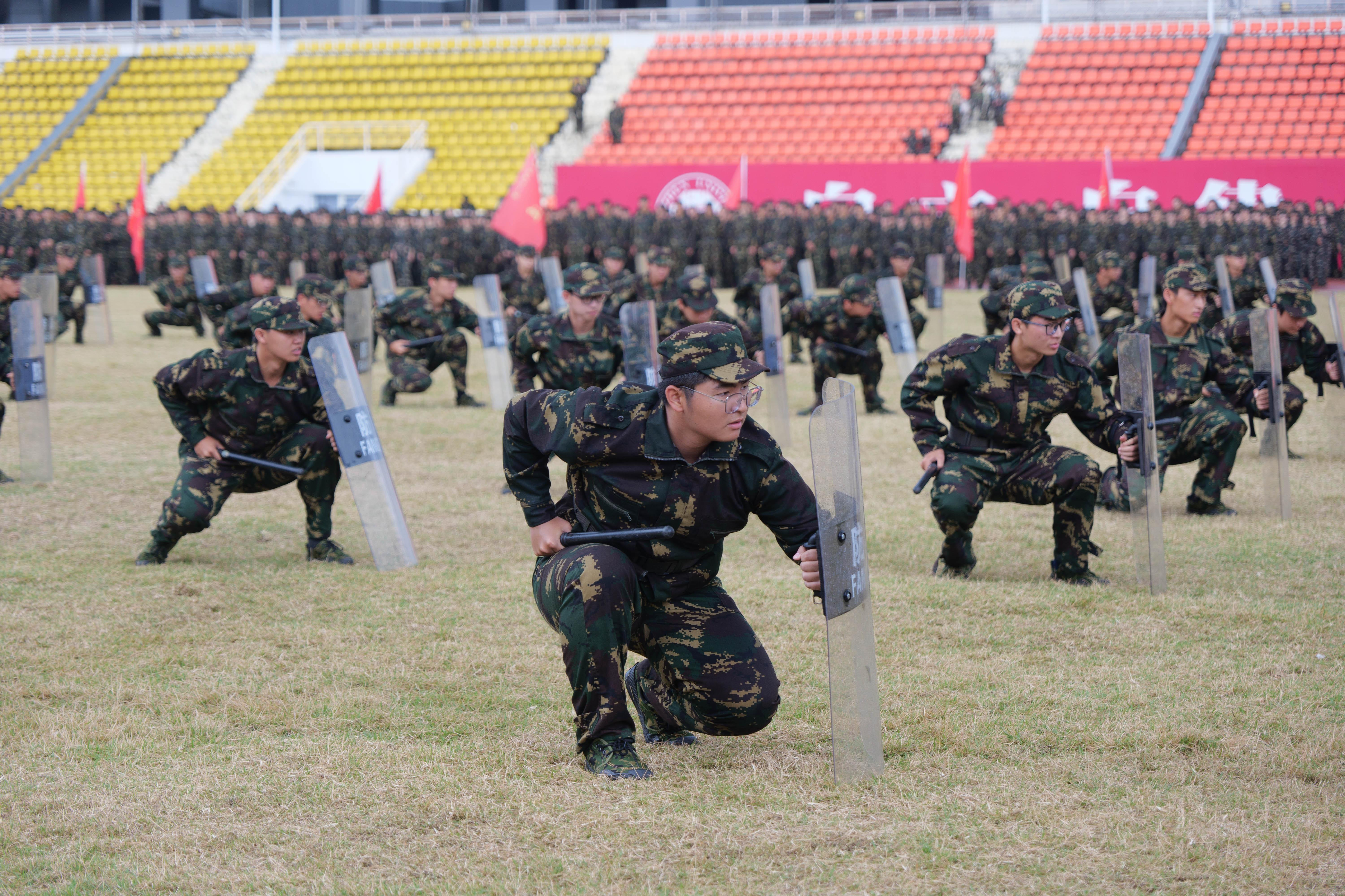 随后,两校区军训成果汇报表演正式开始。在分列式中,2022级军训学生身着陆军迷彩服,队列整齐,步伐矫健,口号嘹亮,以整齐的方阵依次经过主席台。特色科目表演有女子匕首操、男子棍棒操、女子广播体操、男子盾牌操等。突如其来的大雨没有影响同学们的坚毅和热情,同学们以整齐划一、刚劲有力、精神饱满的表演,为军训画上了完满句号,生动诠释了脚踏实地、自强不息的深大精神,展现了“不忘初心、牢记使命”的责任担当,赢得了阵阵掌声。