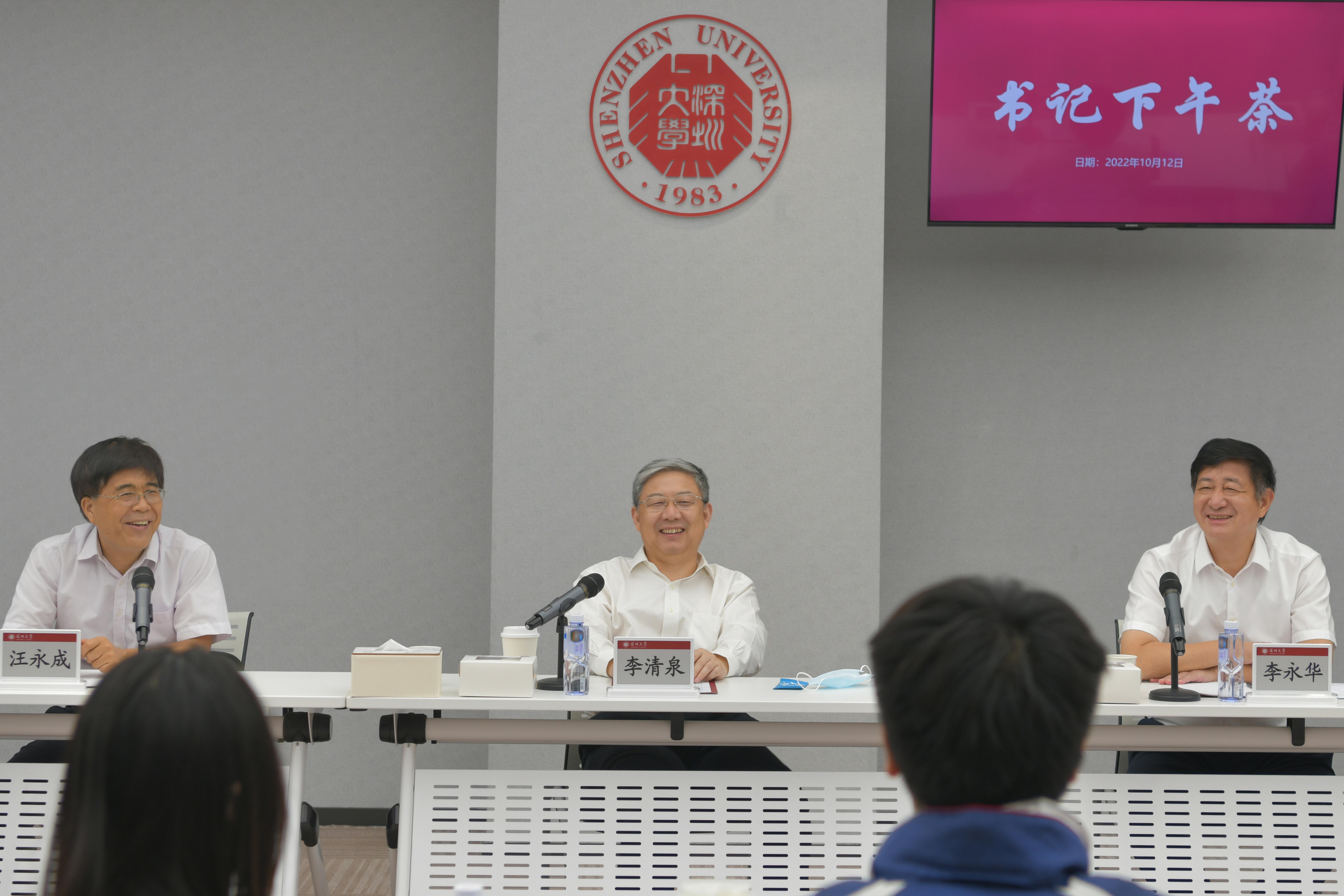 10月12日下午,本学期首次“书记下午茶”在丽湖校区守正楼A座213多功能厅举行。学校党委书记李清泉,副校长李永华、汪永成以及党政办公室、宣传部、校团委、教务部、学生部、丽湖校区管理办公室等职能部门负责人,与来自各学院的23名学生代表面对面交流,共话校内事。