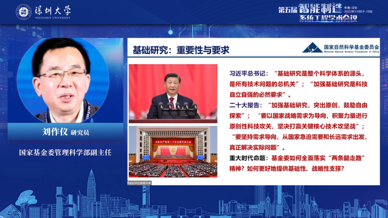 刘作仪以“2022年度基金项目及改革情况”为题,围绕“自由探索:一般项目情况”“面向国家重大需求:有组织的项目情况”两方面,全面汇报了管理科学部在2022年度G01(管理科学与工程)学科的项目资助情况,分享了管理科学部的工作导向、工作思路与工作重点,并对学者们的研究工作提出了建设性意见。他特别强调了研究工作科学严谨、诚信可靠的重要性,希望与会专家学者在智能制造领域提炼出与管理科学相关的切实有效的前沿理论,共同推动制造业高质量发展。