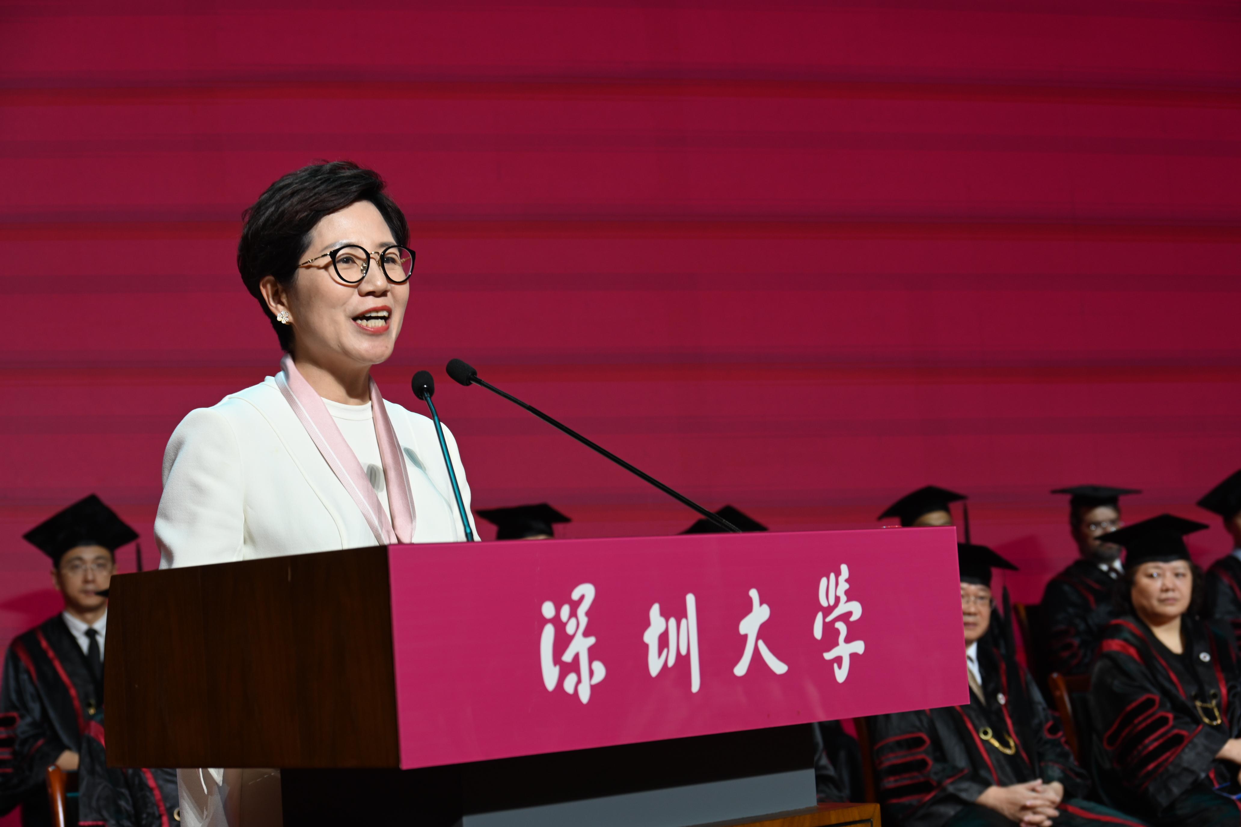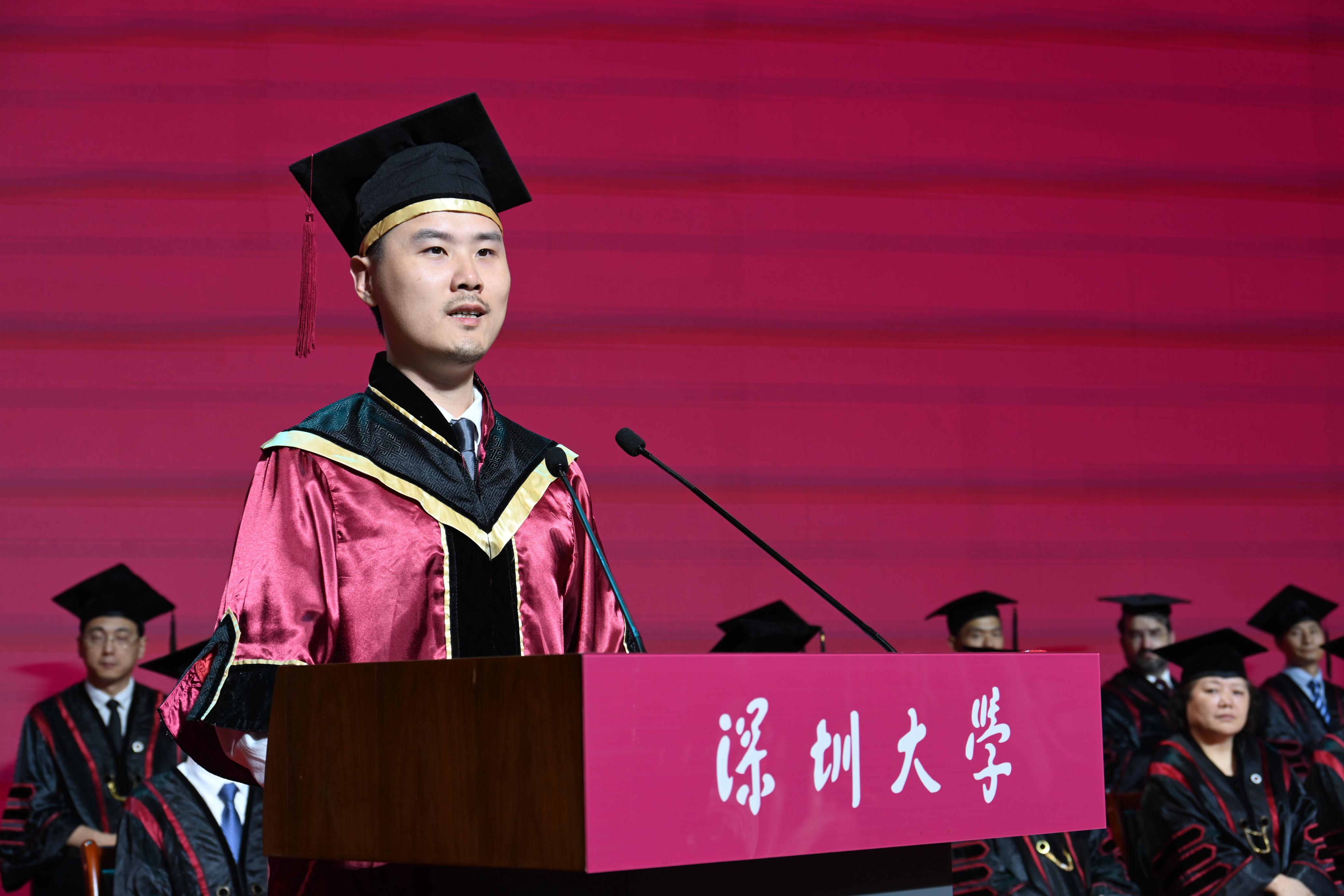 邱桐向所有毕业生“喊话”,要以一颗温暖的心照亮别人的夜,展现“深大温度”;成为一位影响者、创造者,坚持终身学习,不忘造福行善,展现“深大气度”!