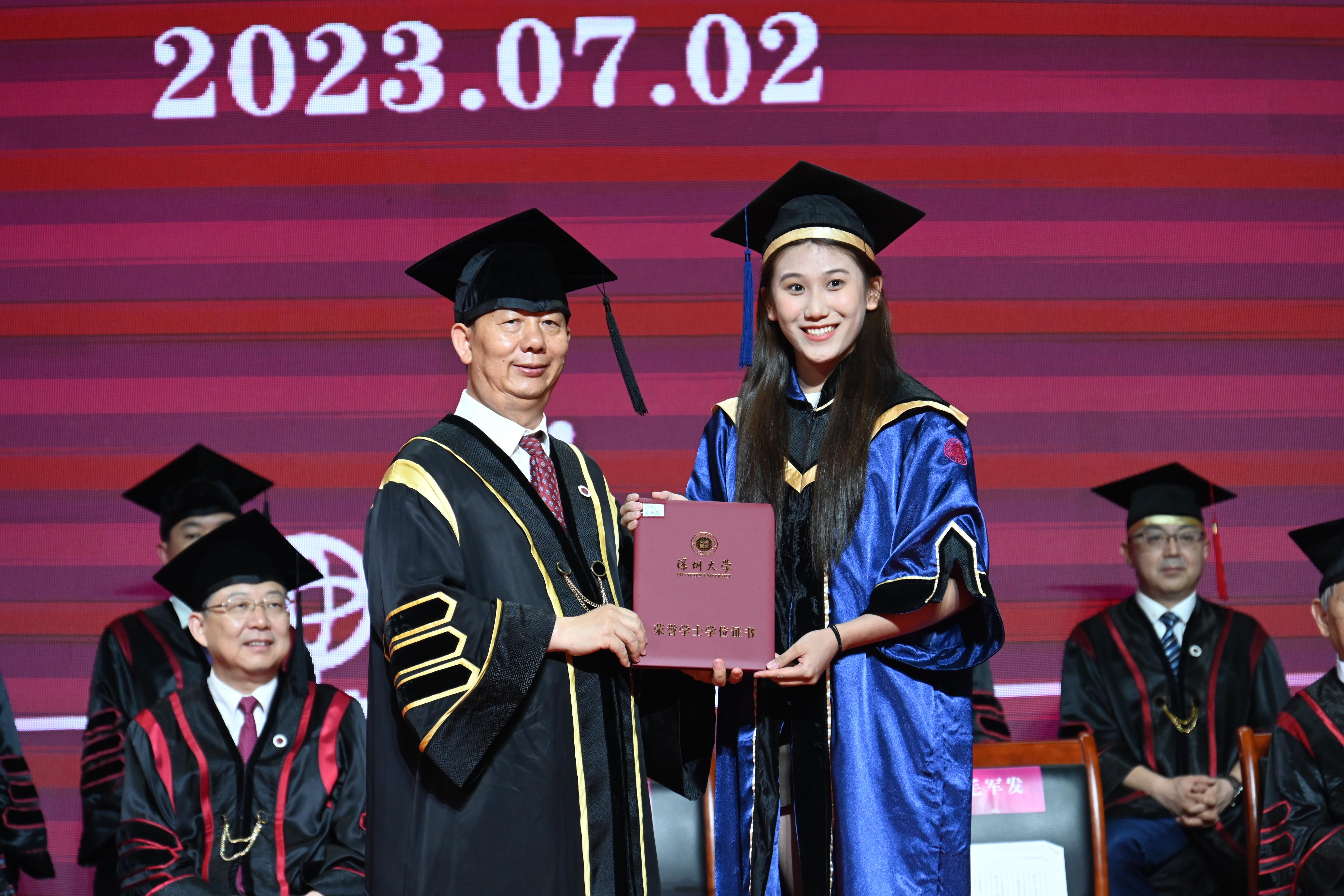 2023年,深大共有6615名全日制普高应届本科毕业生。截至6月20日,共有5232名全日制普高本科生按照教学计划要求完成专业学习,按期取得毕业证书。本学期期末考试后仍将有部分学生达到相关教学计划要求并取得毕业证书和学士学位。已获毕业资格的毕业生中,5232名学生获得学士学位,201名学生被授予荣誉学士学位,140位同学被授予辅修学士学位,132位同学获得辅修专业证书。今年,共有314名应届本科毕业生获得推免生资格。截至目前,共有1777名同学被清华大学、北京大学、牛津大学、哈佛大学、加州大学伯克利分校等国内外高校和科研机构录取为硕士研究生,占比27.41%,比去年同期增加了2.23个百分点。2023届学生在各类学科竞赛中,共获奖808项,包括国际级26项、国家级290项、省部级492项。324位同学被评为乐竞平台2023届优秀本科毕业生。1173位同学在校期间光荣加入了中国共产党。此外,深大还授予2489人成人高等教育本科毕业生学士学位。