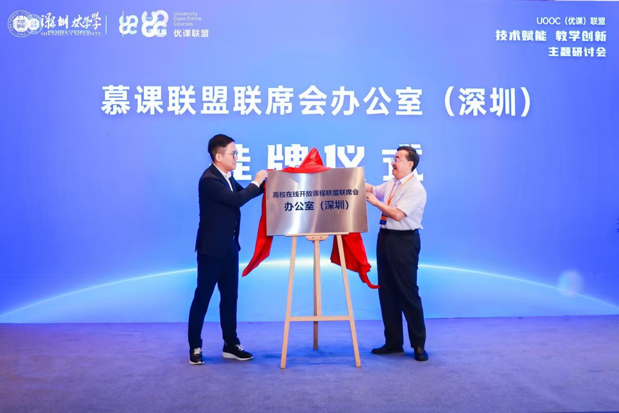 今年,联席会决定在深圳设立办公室,办公室设在优课联盟课程运营中心深大优课公司。会上,徐晓飞和深大优课公司总经理姚凯一同为慕课联盟联席会办公室(深圳)揭牌。