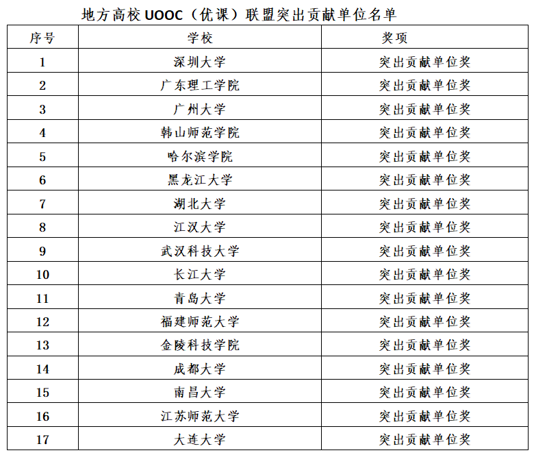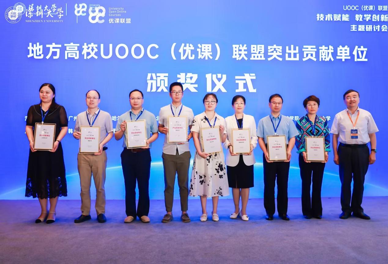 李清泉和徐晓飞为获得地方高校UOOC(优课)联盟突出贡献单位奖的17所高校代表颁奖。