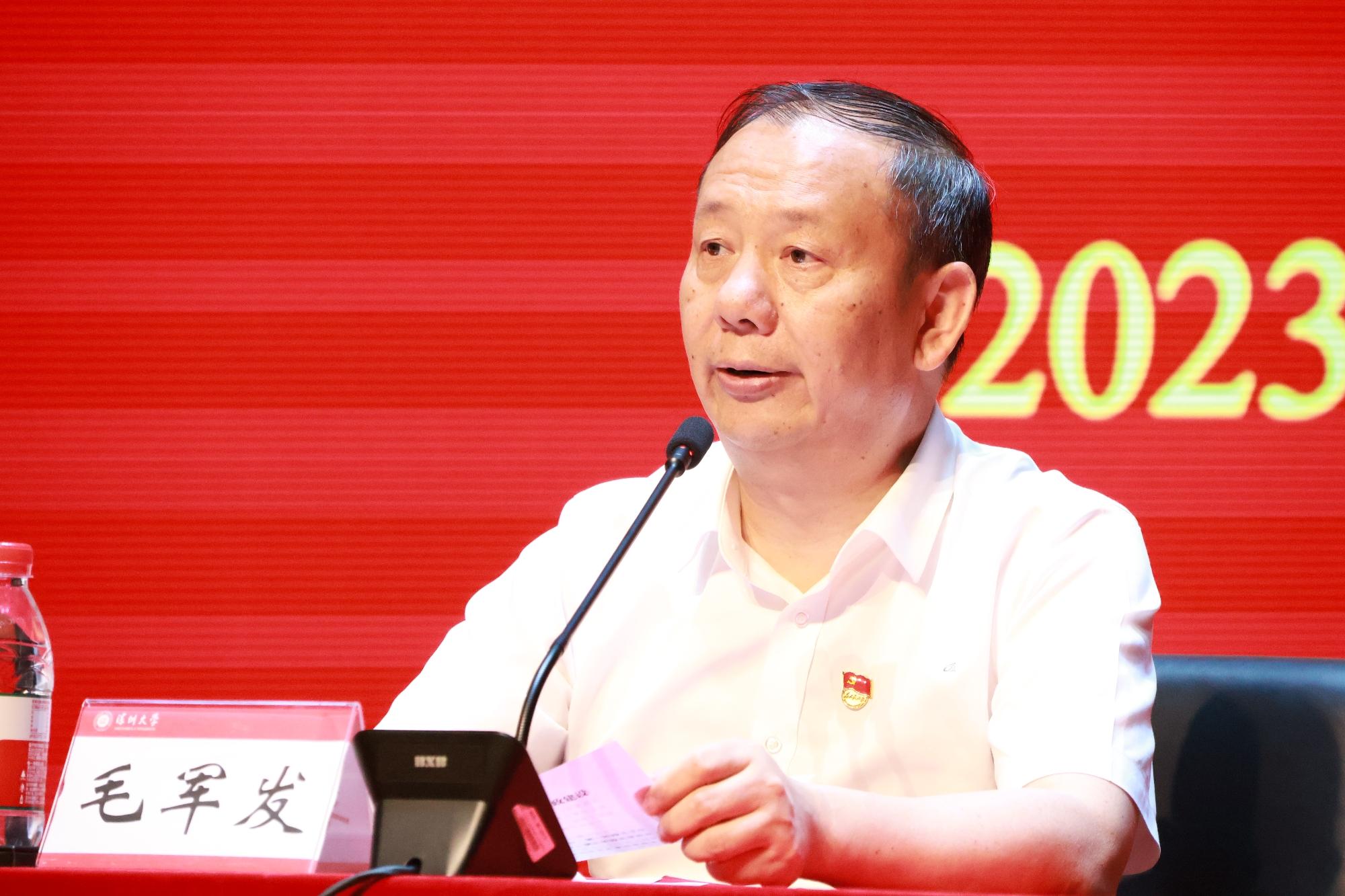 毛军发从学校管理、学科建设、人才成就、师资制度、人才培养、招生就业、科技平台、国际办学、后勤保障、校庆工作等十个方面对2023春季学期工作作总结。他指出,本学期,学校管理有新举措,深化改革内部管理制度,以“质量、特色、贡献”为导向,建立健全考核评价和激励机制,签订学院(部)年度考核目标责任书,激发二级单位创新活力;学科建设有新进展,2023年1月以来,地球科学、免疫学新进ESI全球排名前1%,ESI全球排名前1% 学科增至17个,光学工程学科在US News排名全球第6;高端人才再创佳绩,新引进28位特聘教授,其中两院院士2人、国家级领军人才6人、四青人才9人,多项人才评选项目创历史新高;师资制度更加完善, 3人获聘“人文社会科学资深教授”,完成2023年讲席教授认定工作,科研后备人才政策方面进一步优化管理方式,搭建科研后备人才一揽子管理模式;人才培养有新成果,获国家教学成果二等奖2项,高校竞赛国内及省内排名持续上升,14门课程被认定为第二批国家级一流本科课程,全国高校教师教学创新大赛省赛获奖数量创历史新高,积极筹备“互联网+”大赛省赛;招生就业有新成效,本科招生质量有所提升,毕业生总体就业率逆势上涨,博士研究生规模与生源质量稳步提升;科技平台有新突破,现有5个全国重点实验室,获批粤港澳国家应用数学中心乐竞平台分中心,已申报1个“教育部国家语言文字推广基地”,各类项目申报数同比增长27%,其中国家社科基金后期资助项目申报数同比增长50%;国际办学有新增量,乐竞平台东京学院如期开学,乐竞平台孔子学院在沙特揭牌运行,留学服务中心建成投入使用;后勤保障有新进展,加快推进校园景观提升项目和各类工程建设,荔枝节活动广受关注;校友校庆有声有色,学术校庆活动超过千场,召开乐竞平台校友代表大会并选举产生校友总会新一届理事会,校庆第一期捐赠获捐5.3亿元,并正式启动深大捐赠平台。